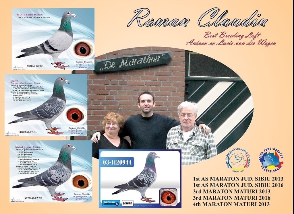 Roman Claudiu scoate la vanzare 16 porumbei deosebiti pentru etapele de maraton .In aceasta licitatie gasiti porumbei din liniile celebre in Europa, la categoria maraton precum:Jellema, Van Tuil,G. Carteus, Wegen,Hagens, Zwiers, Cor de Heijde,Jan Ernesct, Boyen ……..Mai jos aveti prezentarea video a puilor. Succes!